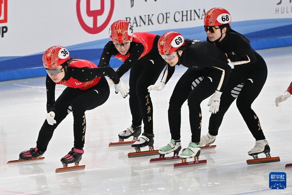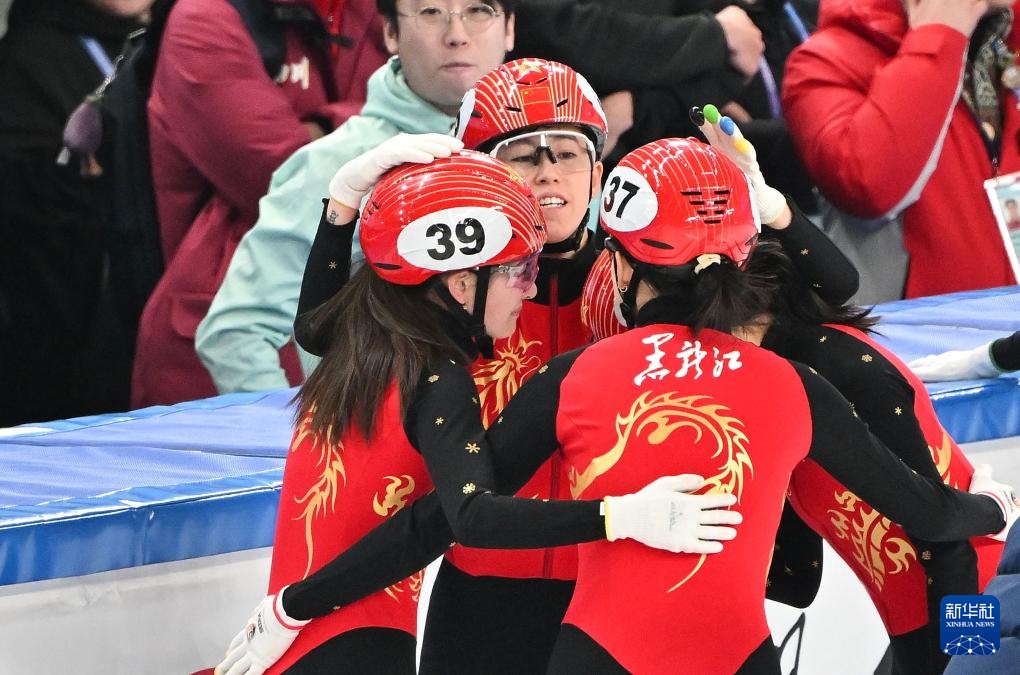 2月18日,黑龍江隊選手范可新(左二)和隊友徐愛麗(左一)、山東隊選手公俐(右一)和隊友李璇在比賽中接力。新華社記者 胥冰潔 攝