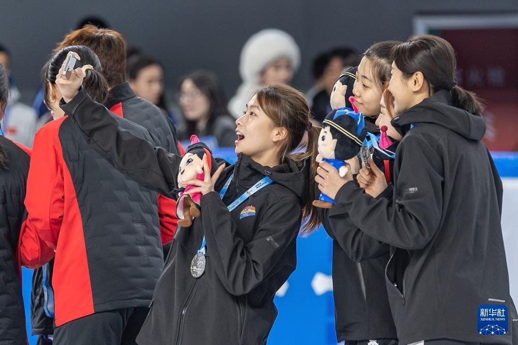 2月18日,黑龍江隊選手徐愛麗、臧一澤、范可新和王欣然(后,從左至右)在賽后向觀眾致意。新華社記者 胥冰潔 攝