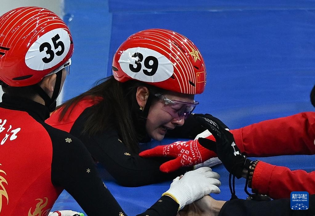 2月18日,黑龍江隊選手王欣然(中)在賽后激動落淚。新華社記者 連振 攝