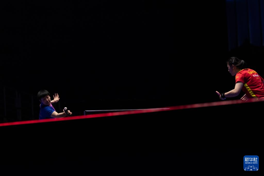 2月18日,中國隊球員孫穎莎(左)在第一盤比賽中回球。最終,她3比0戰勝西班牙隊球員肖瑤茜。新華社記者 張濤 攝