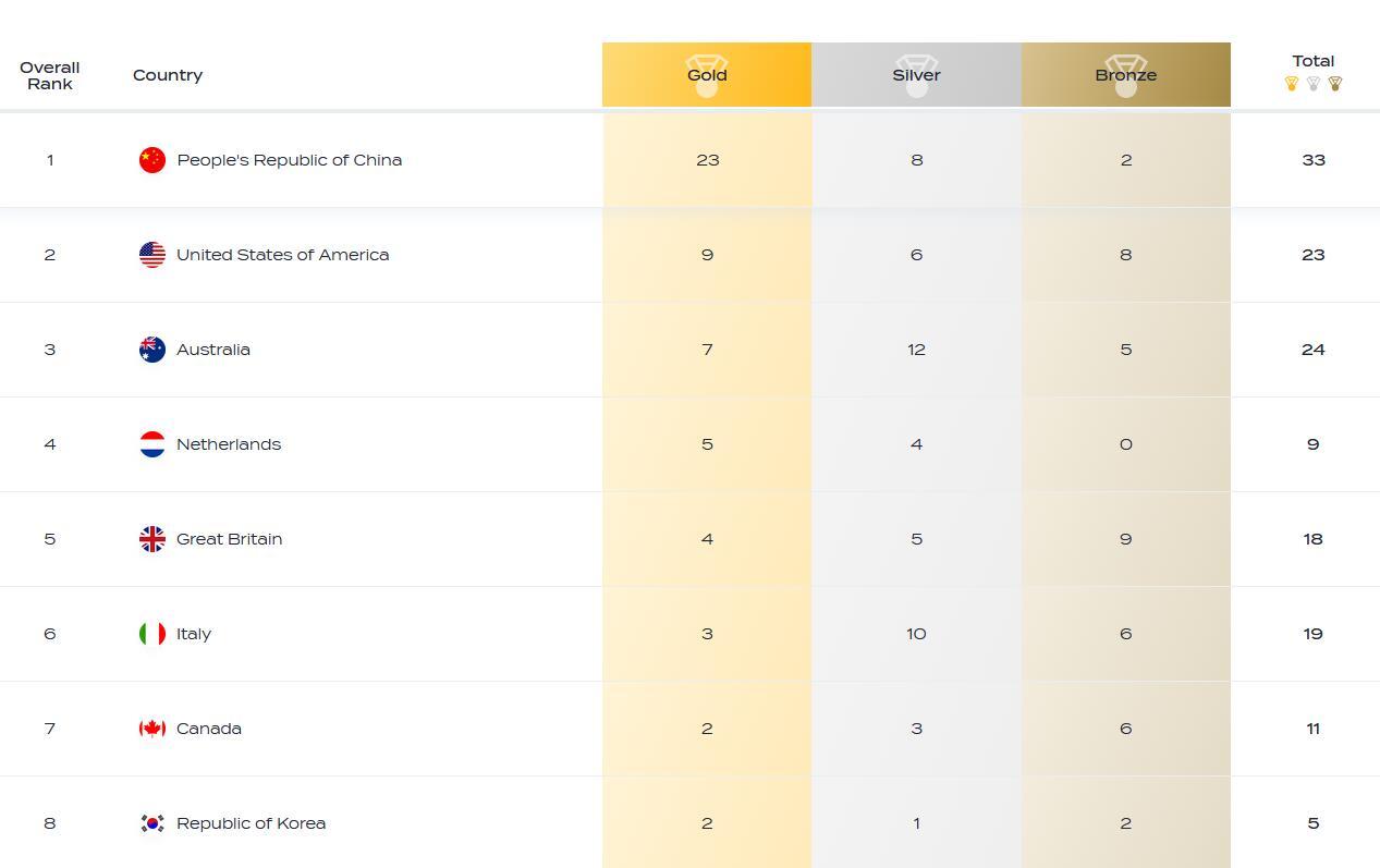 中國隊所斬獲的33枚獎牌來自3個大項,其中跳水項目9金4銀,花樣游泳項目7金1銀1銅,游泳項目7金3銀1銅。