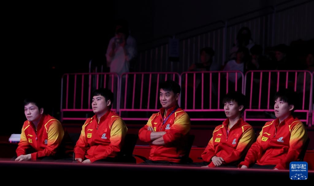 2月19日,中國男隊主教練王皓(中)和隊員樊振東(左一)、梁靖崑(左二)、林高遠(右二)、王楚欽在場邊觀賽。新華社記者 姚琪琳 攝
