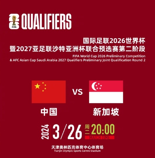 中國足協(xié)19日宣布,國足與新加坡隊的世預(yù)賽主場比賽,將于3月26日20:00開球,比賽地點為天津奧林匹克體育中心體育場(水滴體育場)。