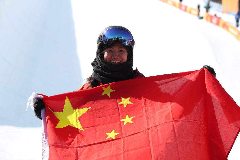 2018年2月13日,中國選手劉佳宇在比賽后慶祝。當日,在2018年平昌冬奧會單板滑雪女子U型場地技巧決賽中,劉佳宇獲得銀牌。新華社記者費茂華攝