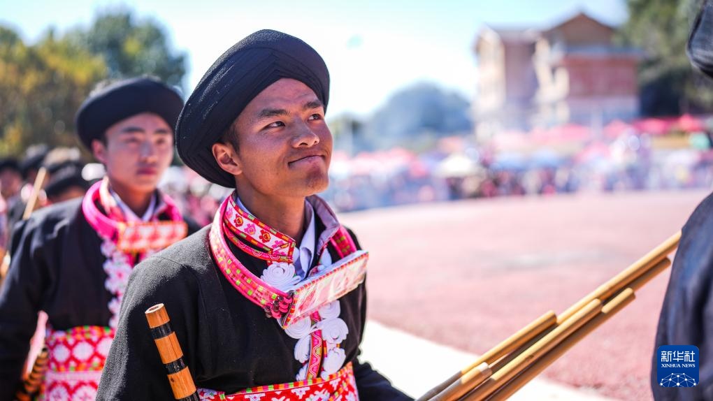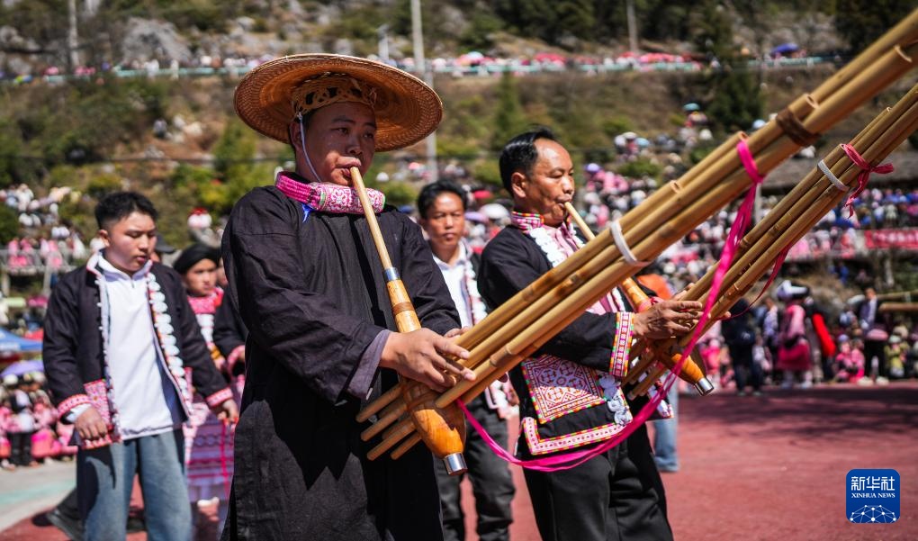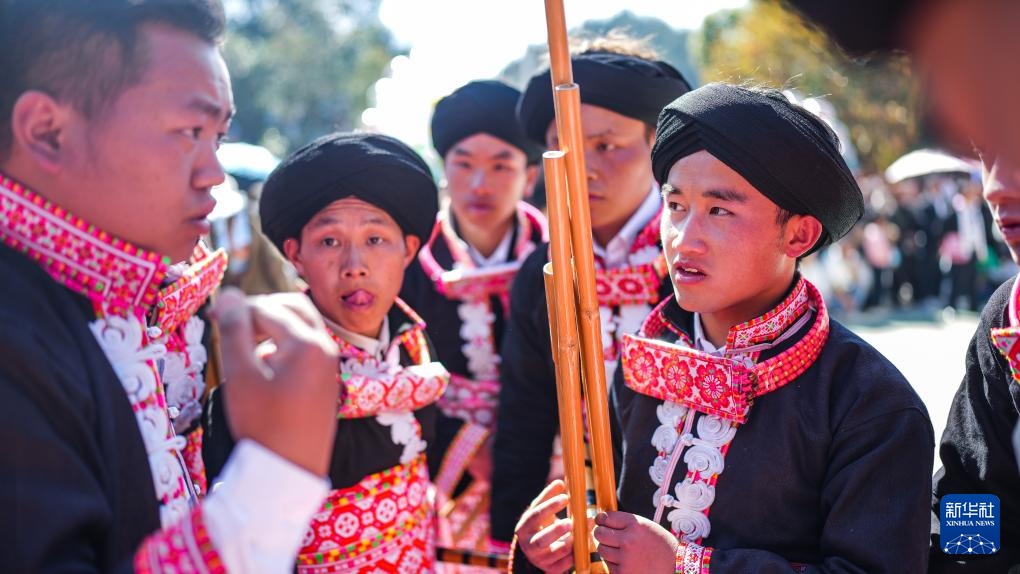 2月19日,苗族群眾在六枝特區梭戛苗族彝族回族鄉高興村跳花場吹奏蘆笙。