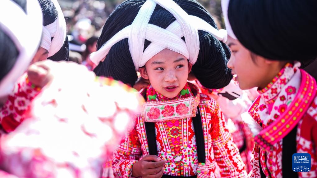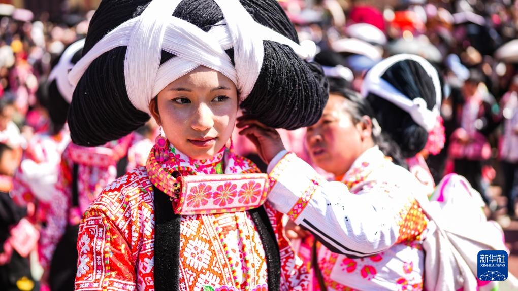 2月19日,長輩在幫助苗族姑娘整理頭飾。