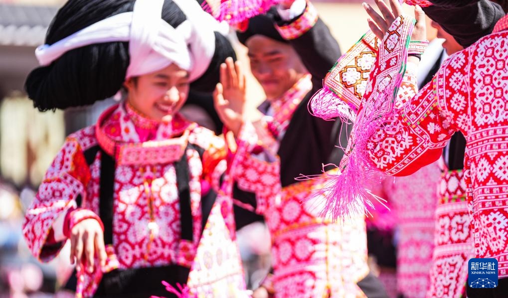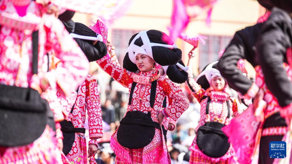 2月19日,苗族群眾在六枝特區梭戛苗族彝族回族鄉高興村跳花場表演舞蹈。
