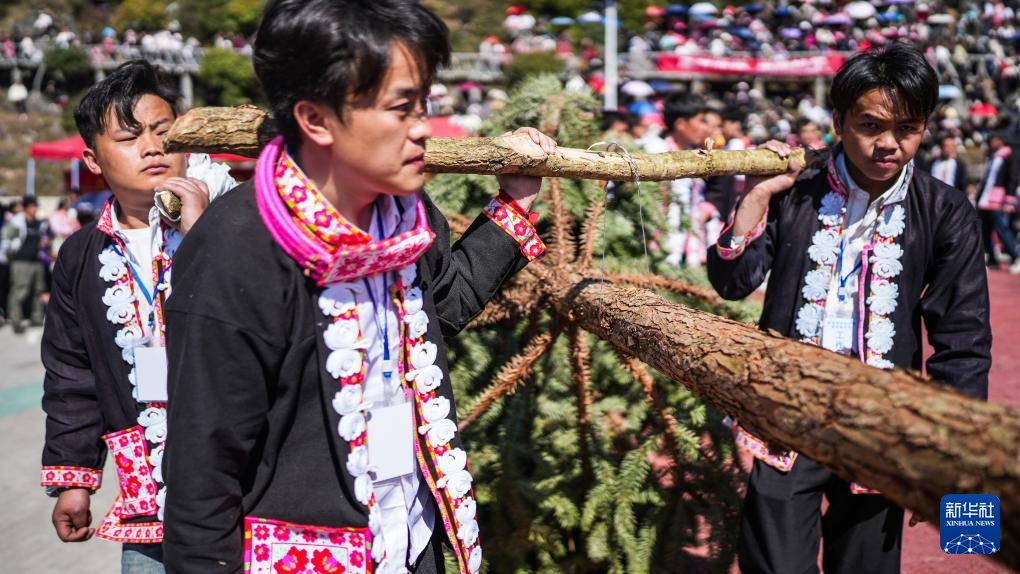 2月19日,苗族群眾在六枝特區梭戛苗族彝族回族鄉高興村跳花場扛起象征幸福的花樹巡游。