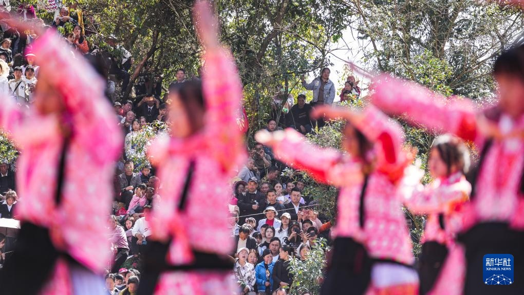2月19日,當地群眾在六枝特區梭戛苗族彝族回族鄉高興村跳花場旁觀看表演。