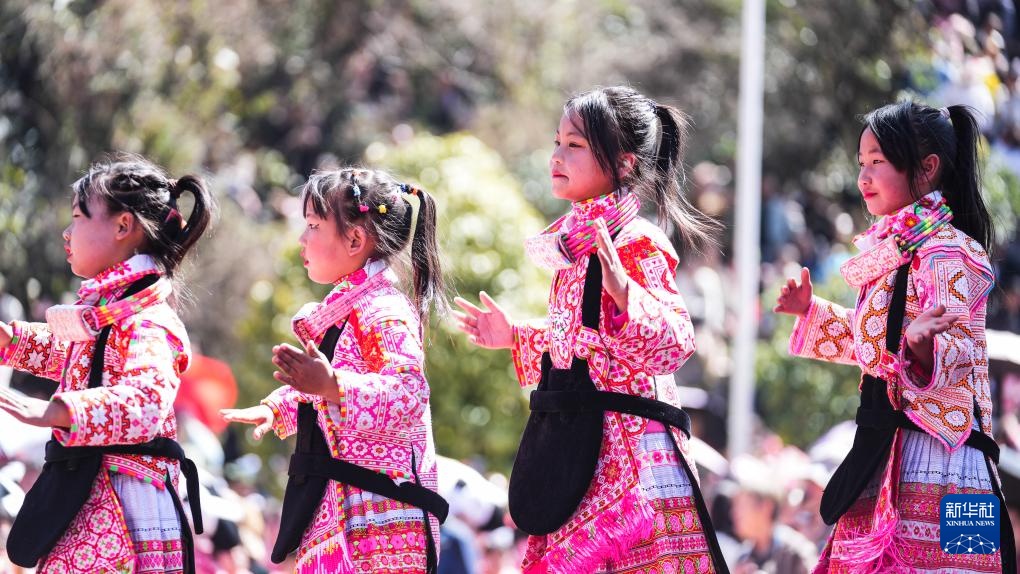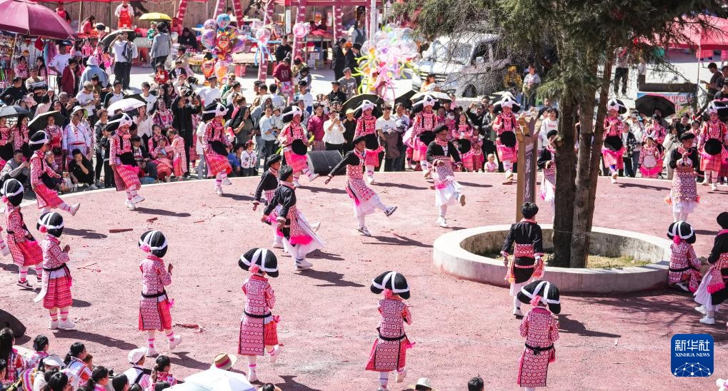 2月19日,小朋友在六枝特區梭戛苗族彝族回族鄉高興村跳花場表演舞蹈。