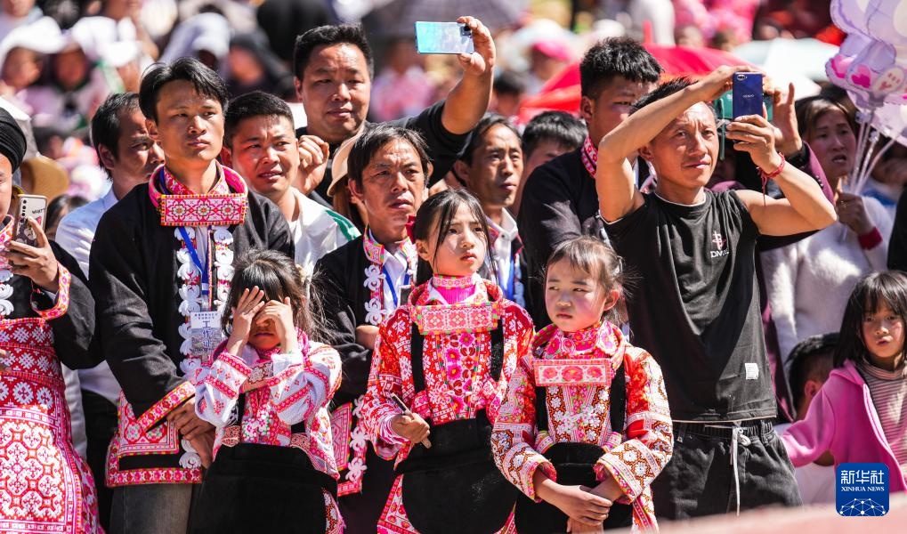 2月19日,苗族群眾在六枝特區梭戛苗族彝族回族鄉高興村跳花場旁觀看表演。