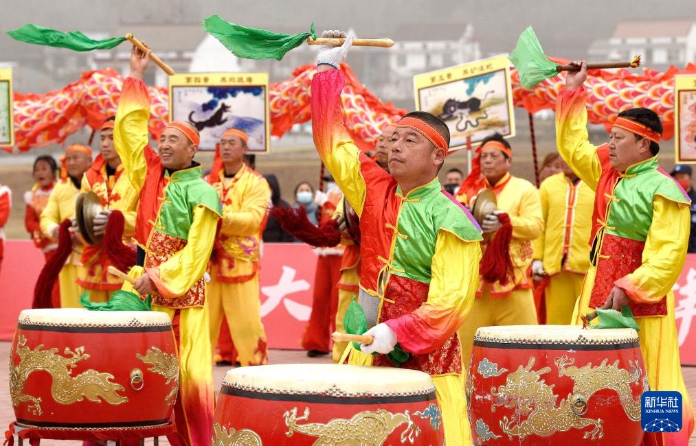 西安市鄠邑區甘亭街道的群眾在蔡家坡終南劇場進行鼓舞表演(2月18日攝,無人機照片)。