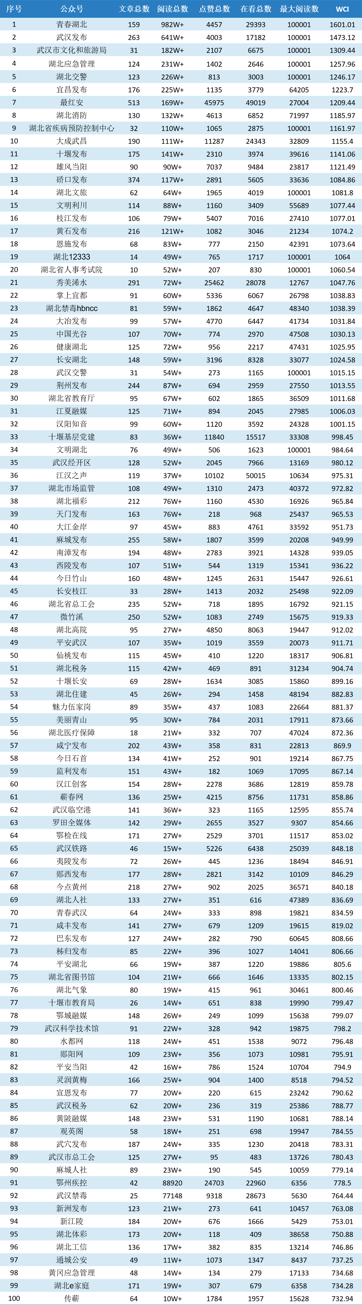 1、聚集湖北省內(nèi)主要黨政機(jī)關(guān)政務(wù)微信公眾號,根據(jù)WCI指數(shù)數(shù)據(jù)進(jìn)行科學(xué)排行,主要從“整體傳播力”“篇均傳播力”“頭條傳播力”“峰值傳播力”四個維度進(jìn)行評價。