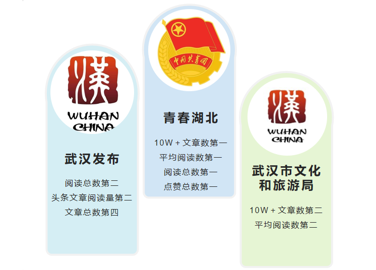 本期,原創(chuàng)文章榜單TOP30的推文主要出自5個賬號,分別為“武漢市文化和旅游局”“武漢交警”“青春湖北”“武漢發(fā)布”“大冶發(fā)布”。其中,“武漢市文化和旅游局”貢獻(xiàn)23篇原創(chuàng)文章上榜,其中5篇閱讀數(shù)突破十萬;“武漢交警”產(chǎn)出3篇,“青春湖北”產(chǎn)出2篇,發(fā)展?jié)摿^大;“武漢發(fā)布”“大冶發(fā)布”各發(fā)布1篇,期待后續(xù)表現(xiàn)。