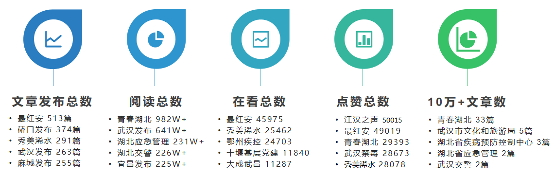 從文章閱讀總數(shù)看,近六成賬號數(shù)量上升整體態(tài)勢良好,其中13個賬號閱讀總量過100萬次,“青春湖北”“武漢發(fā)布”“湖北應(yīng)急管理”“湖北交警”“宜昌發(fā)布”優(yōu)勢明顯,閱讀總量依次為982萬+、641萬+、231萬+、226萬+和225萬+。此外,超五成賬號點(diǎn)贊總數(shù)保持增長,“江漢之聲”以點(diǎn)贊總數(shù)50015位居單項第一,“最紅安”“青春湖北”“武漢禁毒”“秀美浠水”“大成武昌”“鄂州疾控”“武漢發(fā)布”“十堰基層黨建”8個賬號點(diǎn)贊數(shù)量均破萬。