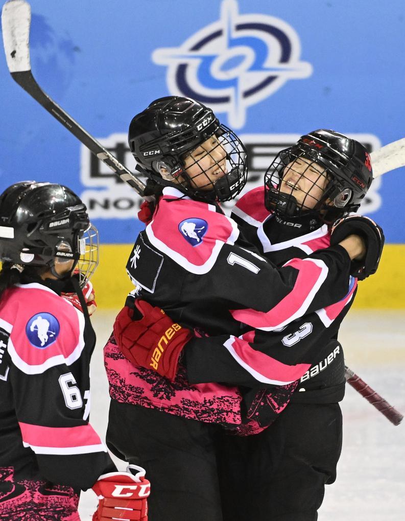 2月19日,北京隊球員吳思嘉(右)與隊友戴米慶祝進球。新華社記者 鄧華 攝