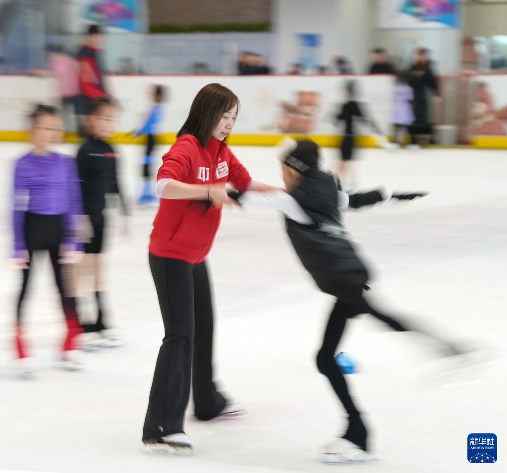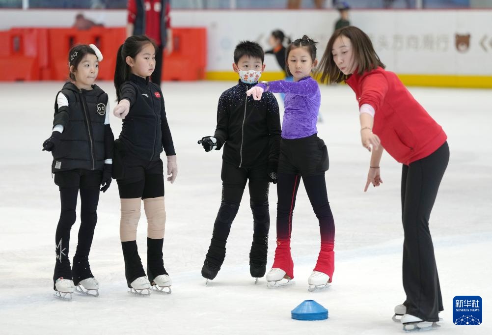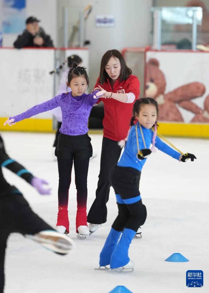 這是2月19日,一名冰場教練員(右一)在沈陽冰紛萬象滑冰場指導小學員滑冰技術。新華社記者 李鋼 攝