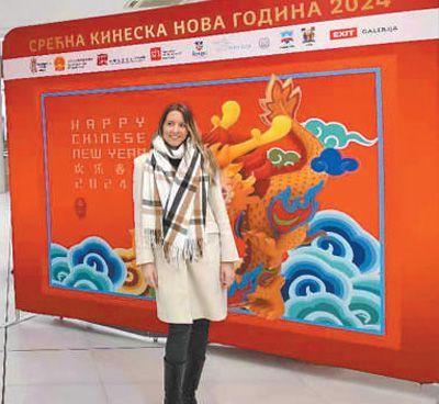 1月30日,在塞爾維亞諾維薩德,一位女士在“歡樂春節”活動展板前留影。本報記者 謝亞宏攝