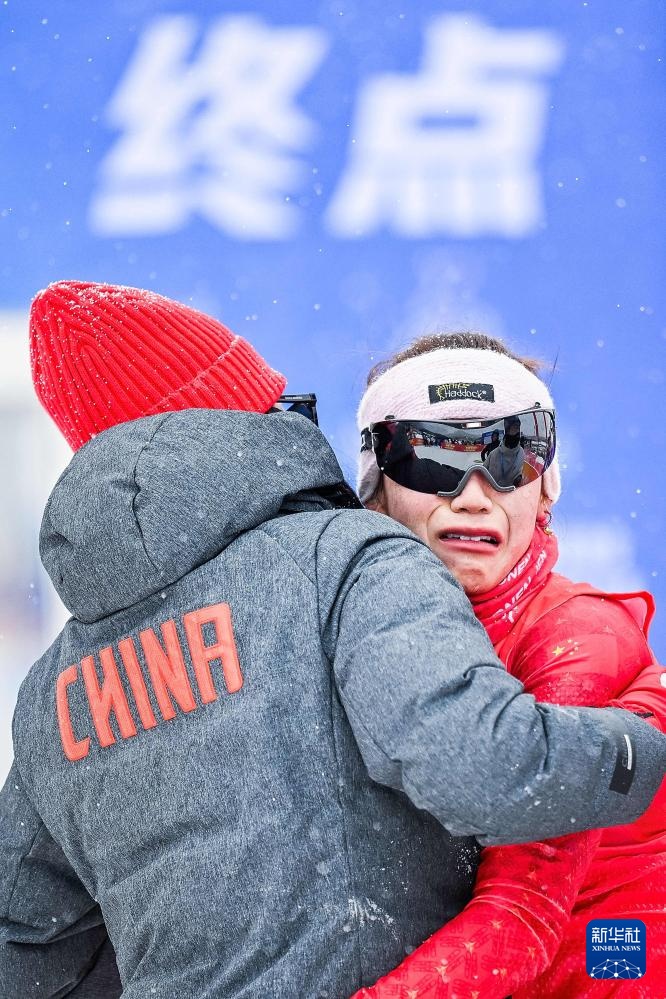 2月20日,遼寧隊教練在終點處擁抱安慰遼寧隊選手丁雨歡(右)。新華社記者 伍志尊 攝