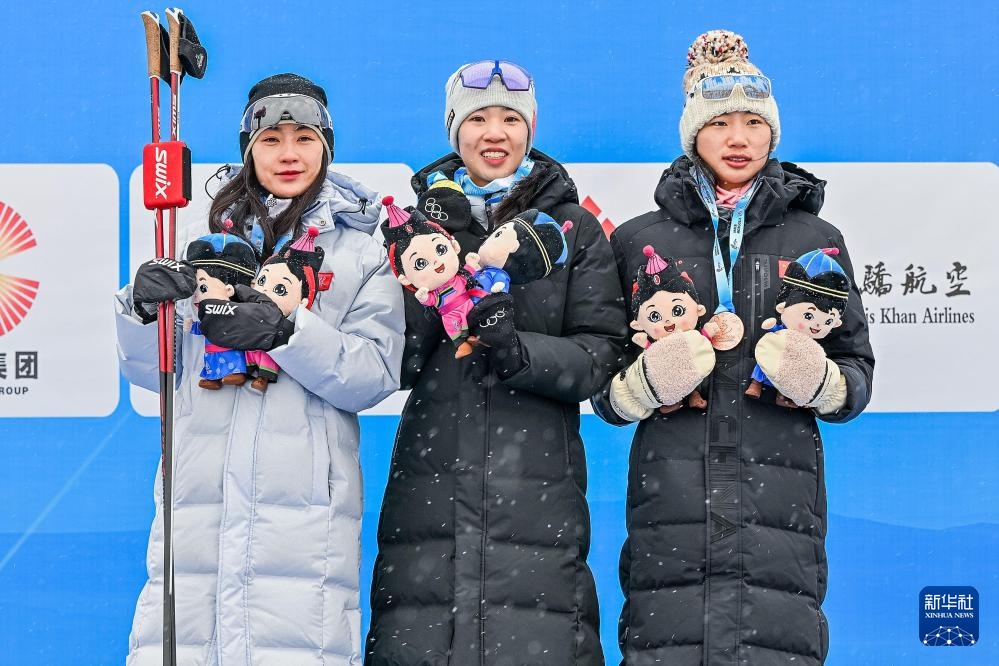 2月20日,冠軍河北隊選手褚源蒙(中)、亞軍吉林隊選手孟繁棋(左)和季軍遼寧隊選手楊連紅在頒獎儀式上。新華社記者 伍志尊 攝