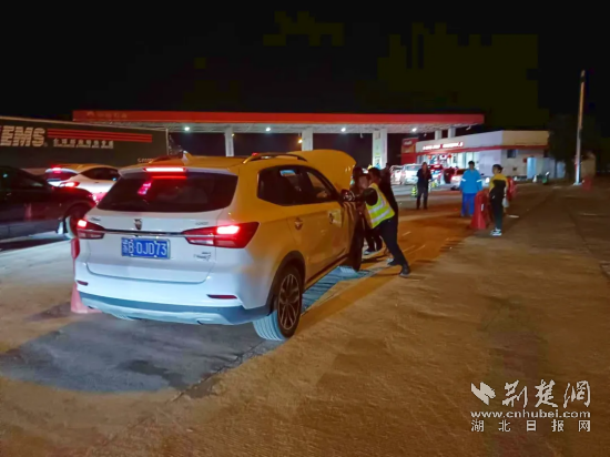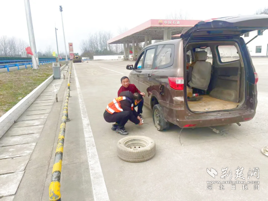 淅河停車(chē)區(qū)工作人員引導(dǎo)并幫助車(chē)輛爆胎司機(jī)更換備胎