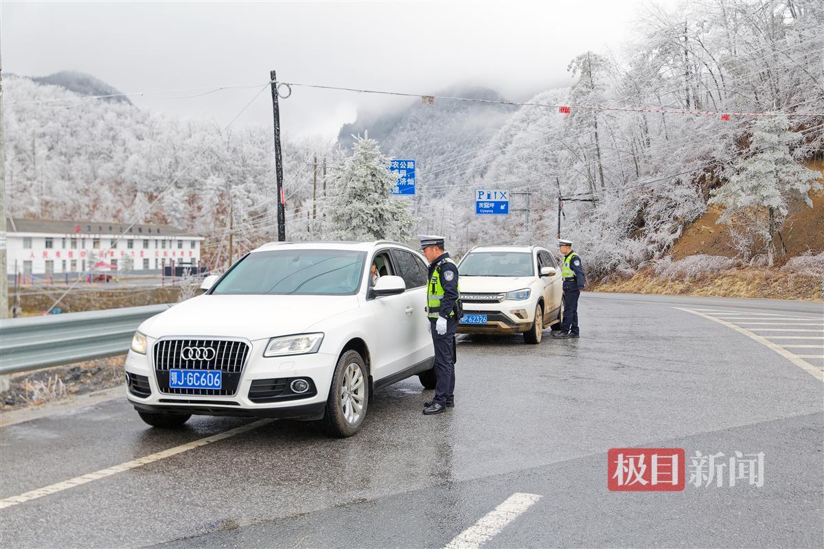 2月20日,神農架林區公安局民警開展定點值守,提醒群眾安全駕駛(通訊員供圖)