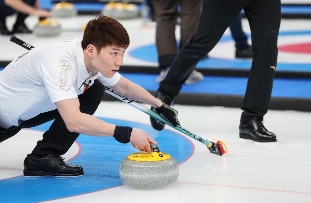 2022年2月12日,王智宇在北京2022年冬奧會男子冰壺循環賽中國隊對陣意大利隊的比賽中擲壺。新華社記者 楊磊 攝
