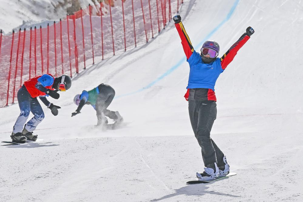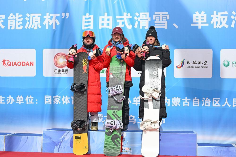 2月19日,在第十四屆全國冬季運動會單板滑雪青年組女子障礙追逐比賽中,西藏隊選手擁青拉姆、湖北隊選手楊禮妍和遼寧隊選手馮賀分獲前三名。新華社記者 李志鵬 攝