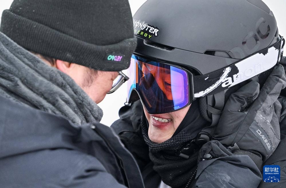 2月21日,吉林隊葉康佳(右)在比賽結(jié)束后與教練擁抱慶祝。新華社記者 伍志尊 攝