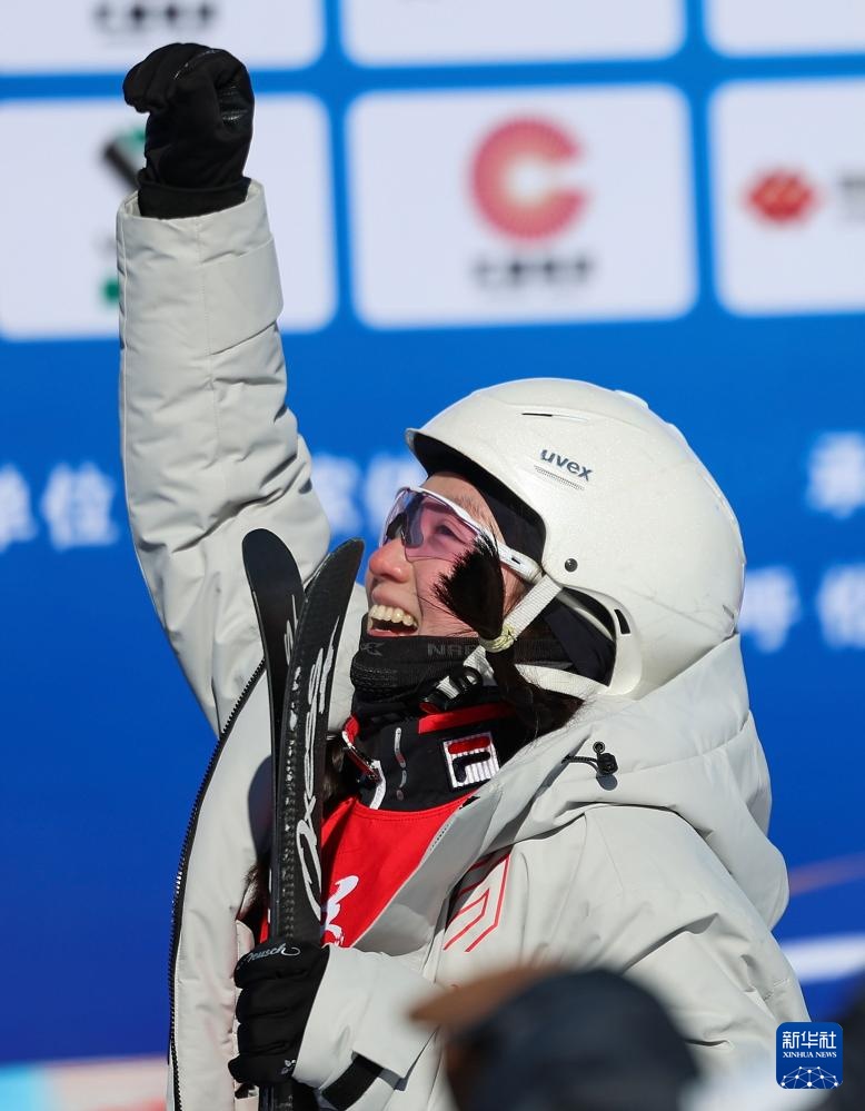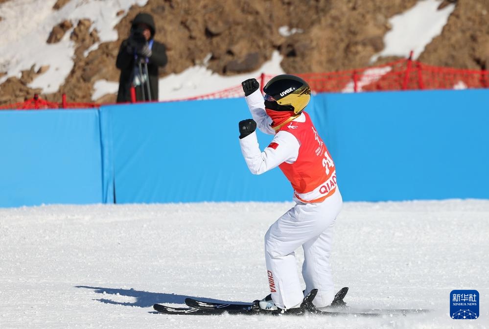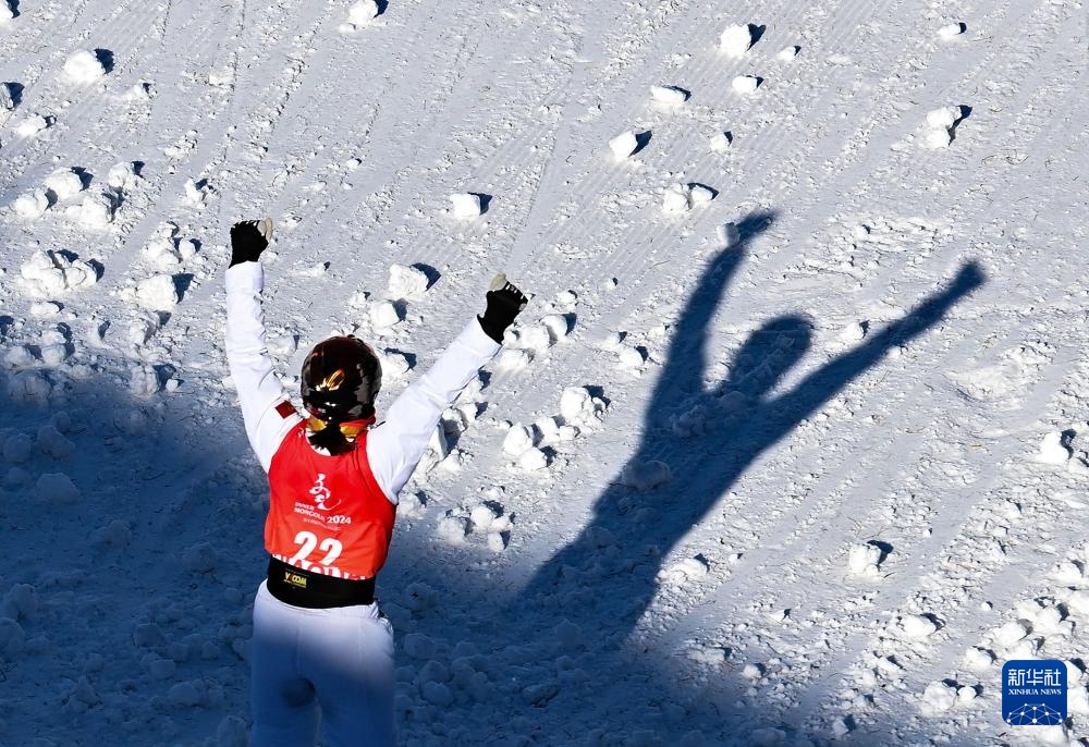2月21日,黑龍江隊選手孔凡鈺在落地成功后慶祝。新華社記者 楊冠宇 攝