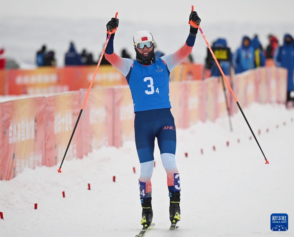2月21日,新疆隊葉爾那爾·阿布得勒汗在終點處慶祝。新華社記者 趙子碩 攝