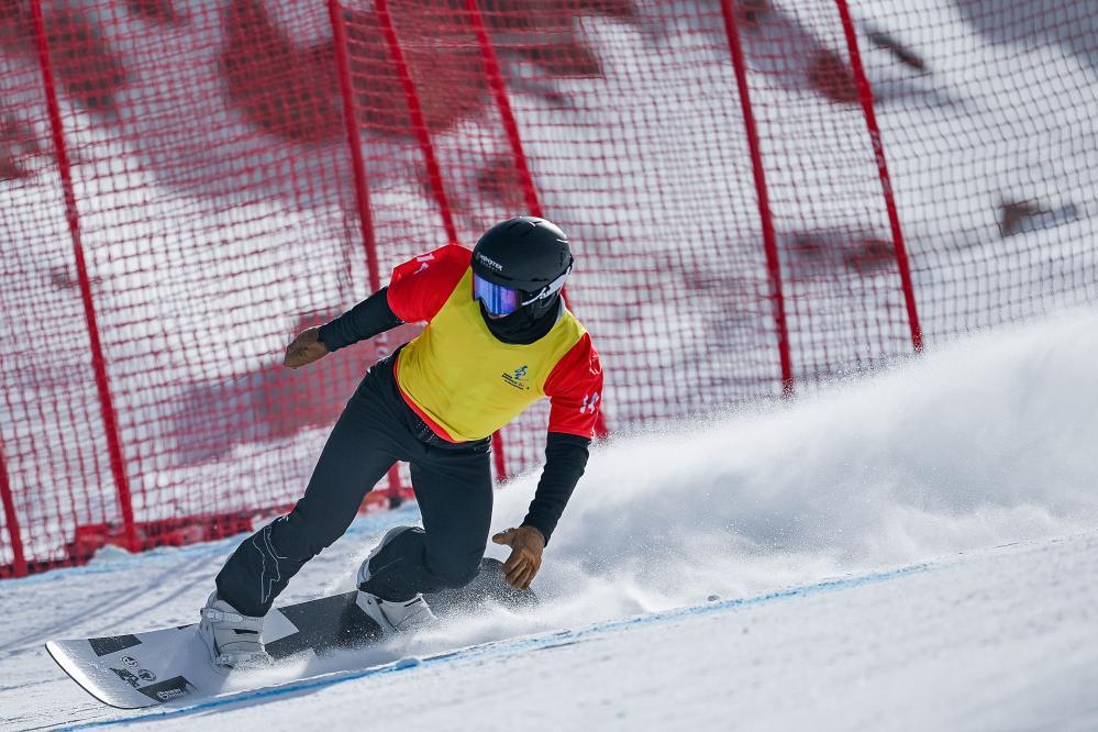 2月19日,吉林隊(duì)選手葉康佳在第十四屆全國冬季運(yùn)動會單板滑雪公開組男子障礙追逐比賽中。新華社記者 伍志尊 攝