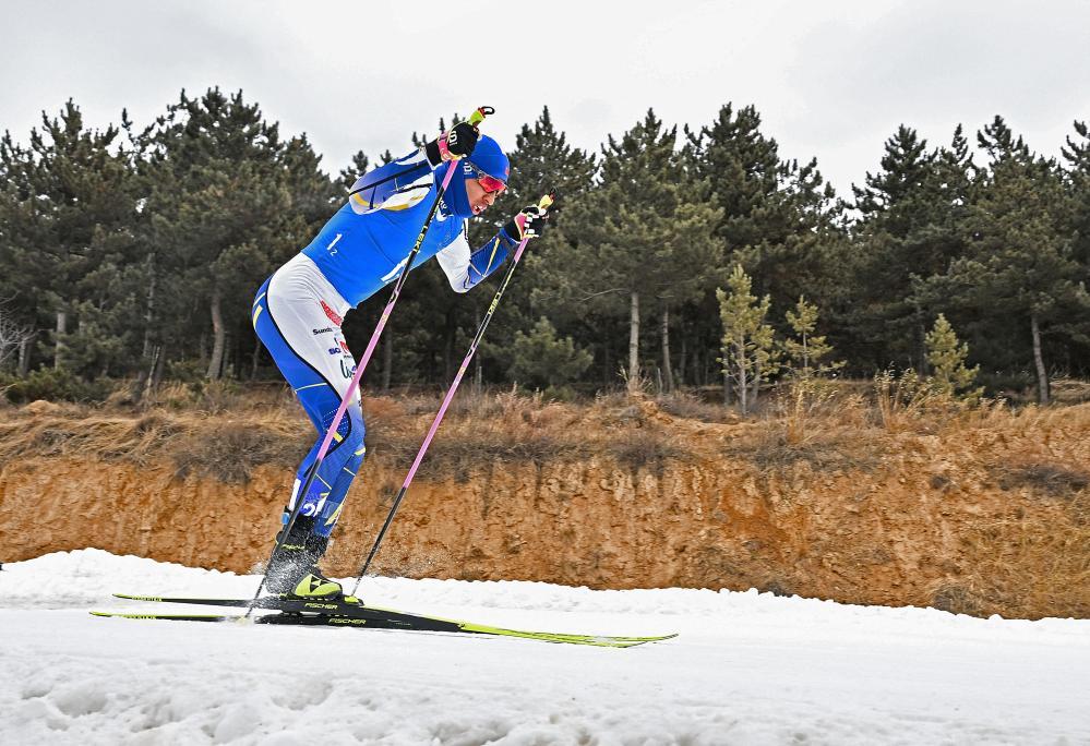 2月19日,重慶隊選手王強在比賽中。當日,在越野滑雪公開組男子團體短距離(自由技術)決賽中,重慶隊以17分30秒39的成績獲得冠軍。新華社記者 劉磊 攝