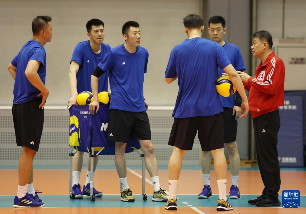 2月22日,中國女排主教練蔡斌(右一)在訓練間隙與教練組成員交流。新華社記者 賈浩成 攝