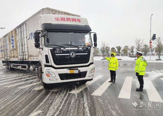 “雪天路滑,請廣大駕駛人遵守交規,減速慢行、注意安全……”22日7時30分,寒風凜冽、路面濕滑,在華容區華容鎮,交警部門提前開始早高峰勤務,通過喊話器提醒過往車輛駕駛人拉開車距、減速慢行。