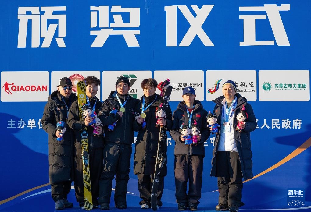 2月22日,冠軍河南隊選手何金博(右三)、亞軍山東隊選手張世豪(左二)、季軍貴州隊選手劉鑫鵬(右二)在頒獎儀式上合影。新華社記者 謝劍飛 攝