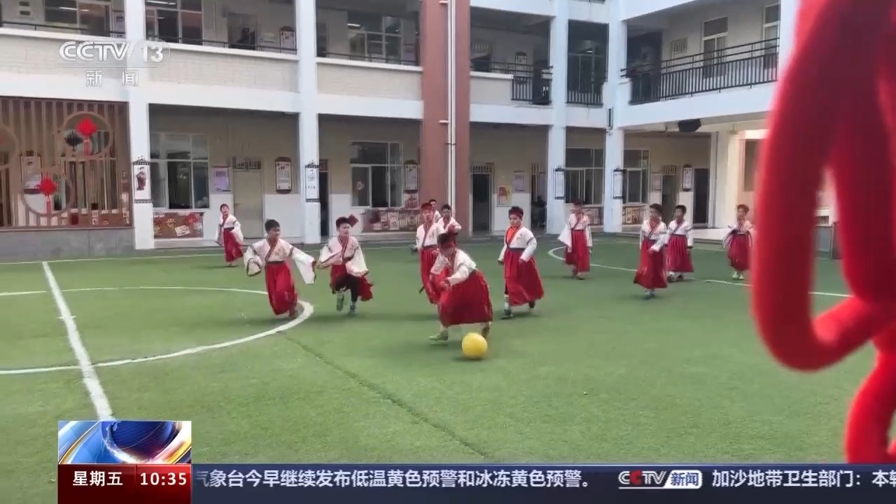 學校還組織了一系列傳統文化特色活動。在操場上,同學們換上傳統漢服,一起體驗蹴鞠的魅力。