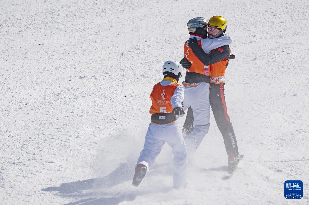2月23日,吉林隊選手李天馬(右)在落地后和隊友擁抱。新華社記者 謝劍飛 攝