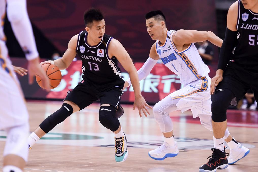 2020年6月20日,遼寧隊球員郭艾倫在比賽中帶球突破首鋼隊球員林書豪的防守。新華社記者 李紫恒 攝