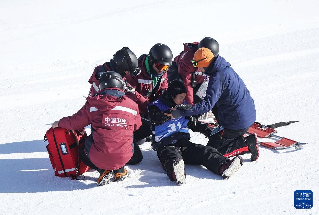 2月24日,吉林隊選手石明宇(中)在比賽中摔倒后接受醫療救治。新華社記者 龍雷 攝