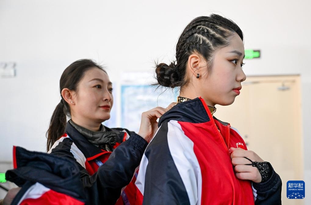 2月20日,香港花樣滑冰隊(duì)教練楊芳(左)為隊(duì)員康然整理服裝。