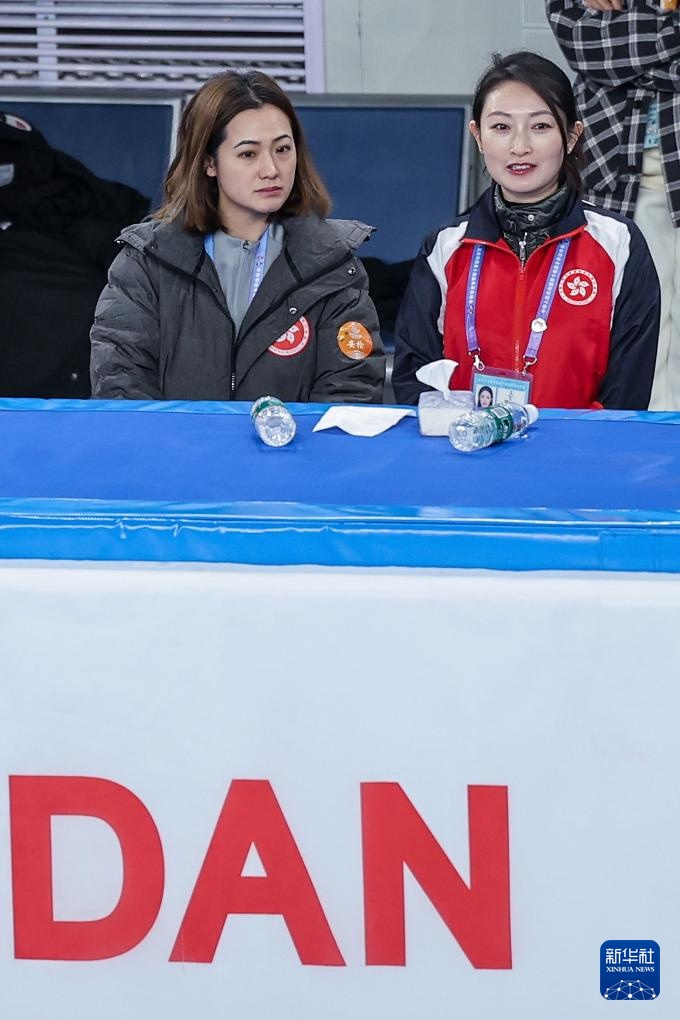 2月21日,在第十四屆全國冬季運(yùn)動(dòng)會(huì)花樣滑冰公開組團(tuán)體賽冰舞韻律舞比賽中,中國香港滑冰聯(lián)盟主席葉丹丹(左)和香港隊(duì)冰舞項(xiàng)目教練楊芳在場邊觀賽。