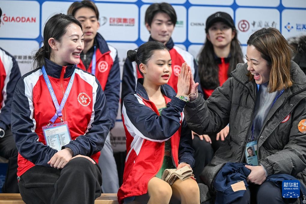 2月21日,在第十四屆全國冬季運(yùn)動(dòng)會(huì)花樣滑冰公開組團(tuán)體賽女子單人滑短節(jié)目比賽中,香港隊(duì)選手郭幸儀(前左二)在等分區(qū)與領(lǐng)隊(duì)葉丹丹擊掌慶祝。
