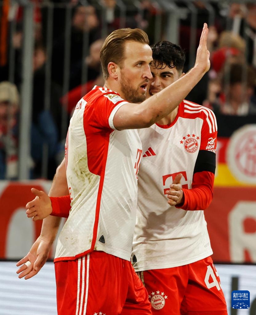 2月24日,拜仁慕尼黑隊球員凱恩慶祝本場個人第二粒進球。新華社發(菲利普·魯伊茲攝)