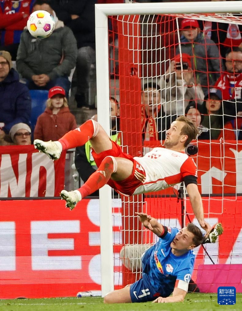 2月24日,拜仁慕尼黑隊球員凱恩(上)在比賽中倒鉤射門。新華社發(菲利普·魯伊茲攝)
