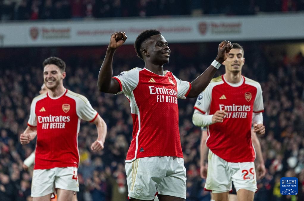 2月24日,阿森納隊球員薩卡(前)慶祝進球。新華社發