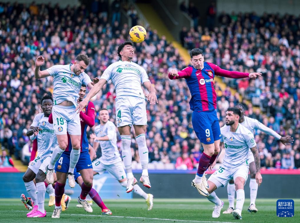 2月24日,巴塞羅那隊(duì)球員萊萬多夫斯基(上右)與赫塔菲隊(duì)球員阿爾瓦雷斯(上中)爭(zhēng)頂頭球。