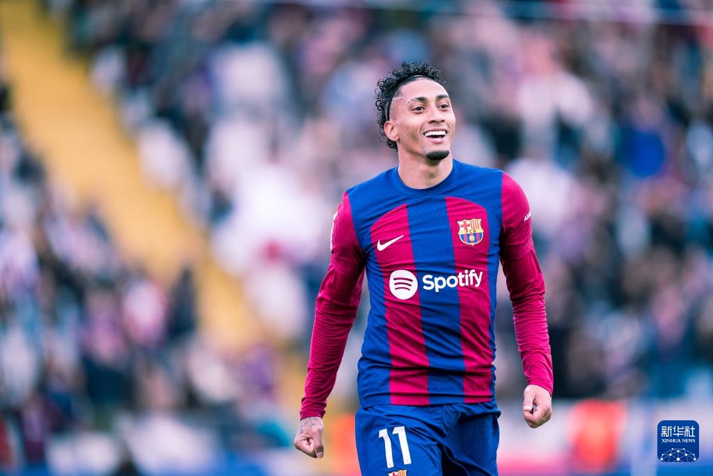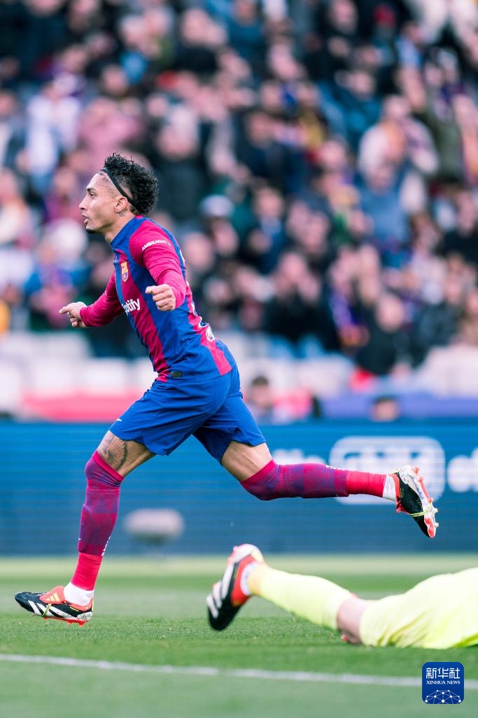 2月24日,巴塞羅那隊(duì)球員拉菲尼亞慶祝進(jìn)球。
