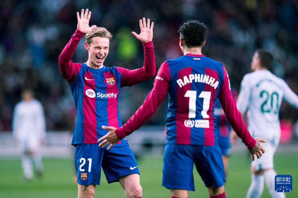 2月24日,巴塞羅那隊(duì)球員德容(左)與隊(duì)友拉菲尼亞慶祝進(jìn)球。