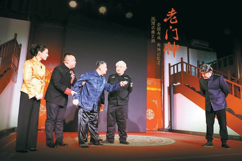 近日,北京曲藝團首部沉浸式曲藝劇《南城記憶——“老門神”》在顏料會館首演。這是一部戲與景深度交融的作品,它的創作靈感受到了曲藝團與熱心的會館保安交往經歷的啟迪,以會館看門人“老門神”為切入點,引出昔年間北京南城老藝人的“藝”與“義”。8位性格鮮明的角色展示了單弦、大鼓、相聲、快板等9種曲藝形式,其中不乏早已隨著社會發展淡出舞臺的拉洋片、牛骨數來寶,近在咫尺的表演和互動極大地添加了觀演樂趣。比如,觀眾入席時,桌上已提前備好了銅錢,方便大家慷慨地“捧個錢場”,親身感受一把拉洋片也是如今越來越難得的一種體驗。